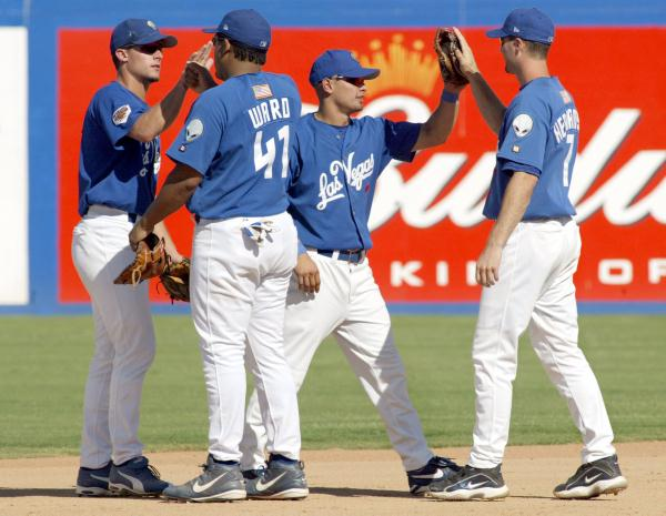 MEMBERS OF THE 51S CELEBRATE after a 10-1 victory against Sacramento in Monday's season finale. From left are: Eric Riggs, Daryle Ward, Shane Victorino and Chad Hermansen.
