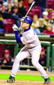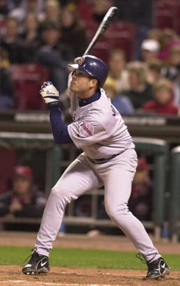 San Diego Padres Shane Victorino watches his two-run hit off Cincinnati Reds pitcher Brian Reith during the eighth inning Friday, April 25, 2003, in Cincinnati. The Padres won 7-3. (AP Photo/Mike Simons)