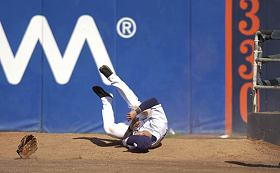 Victorino – starting in right field for the first time – slammed headfirst into the side of the right-field grandstands while chasing a foul drive.